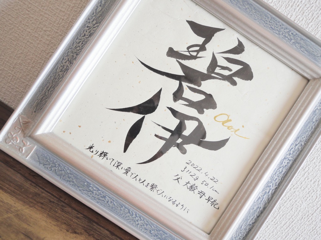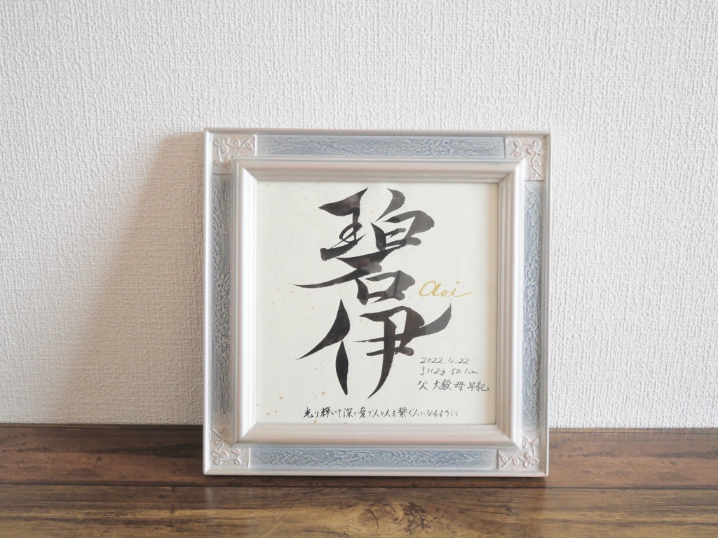 また、額はオーダーを頂いてからお子様ひとりひとり、その字体とイメージにあった額を選定しています。